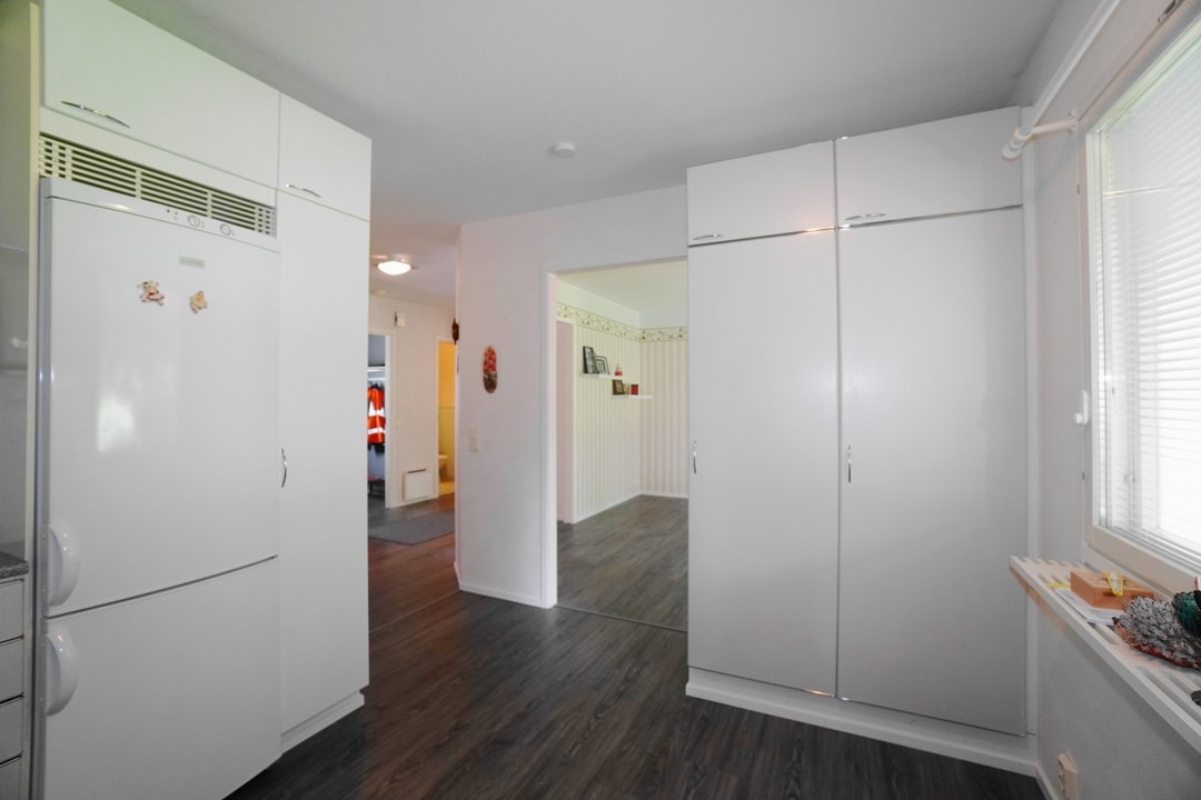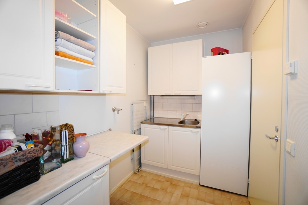 Makuuhuone on tilava ja sen yhteydessä on kaappitilaa. Eteisessä on myös hyvin kaappitilaa säilytystä varten. Kylpyhuone on kauttaaltaan laatoitettu ja oma sauna kruunaa kokonaisuuden. Kodinhoitohuone on iso plussa, sillä siellä on paljon säilytystilaa ja selkeä paikka pesutornille.