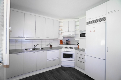 erillinen keittiö, laminaattitasot keittiössä, sähköliesi; liesituuletin, astianpesukone (45cm), jääkaappipakastin, tilaa isolle ruokapöydälle; paljon kaappitilaa; paljon työskentelytilaa; suuri tiskipöytä