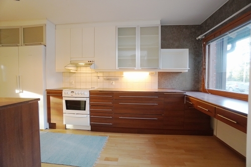 erillinen keittiö, laminaattitasot keittiössä, keraaminen- tai induktioliesi; liesituuletin, astianpesukone (60cm), jääkaappi; pakastin, paljon kaappitilaa; paljon työskentelytilaa