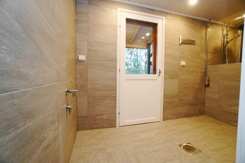 laattalattia; laattaseinä, myös erillinen WC, allaskaappi; peilikaappi, suihku, pesukonevalmius, lattialämmitys; sauna
