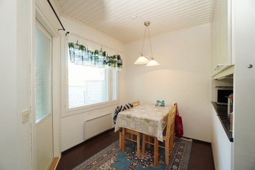 erillinen keittiö, laminaattitasot keittiössä, keraaminen- tai induktioliesi; liesituuletin, astianpesukone (60cm), jääkaappipakastin, tilaa isolle ruokapöydälle; paljon kaappitilaa; paljon työskentelytilaa