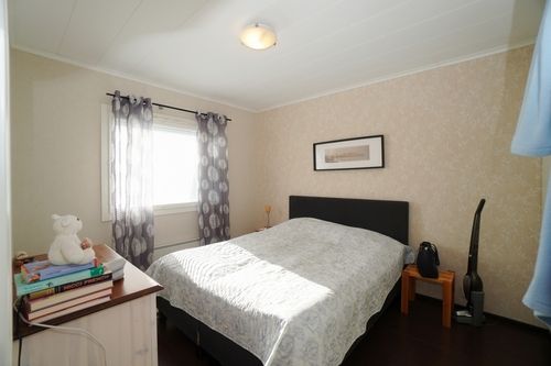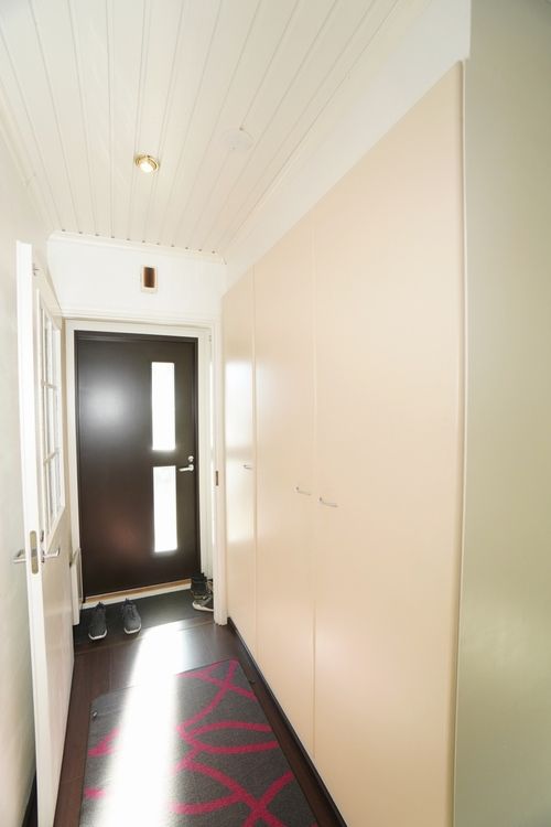 Makuuhuoneen yhteydessä on kaappeja koko seinän mitalta ja lisää kaappitilaa löytyy eteisestä.