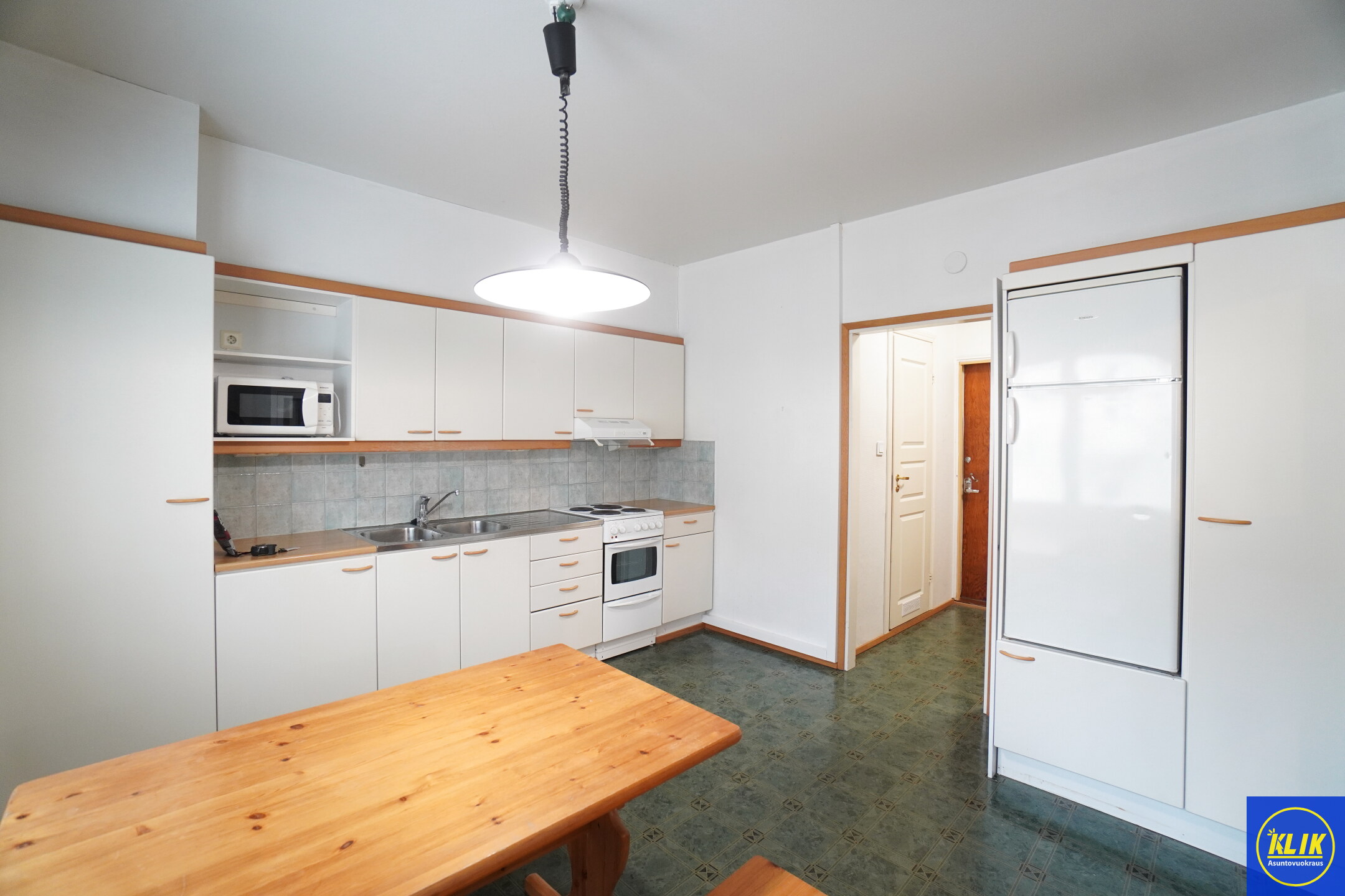 erillinen keittiölaminaattitasot keittiössä, sähköliesi; liesituuletin, , jääkaappipakastin, tilaa isolle ruokapöydälle; paljon kaappitilaa; mikro valmiina keittiössä; mikrohylly