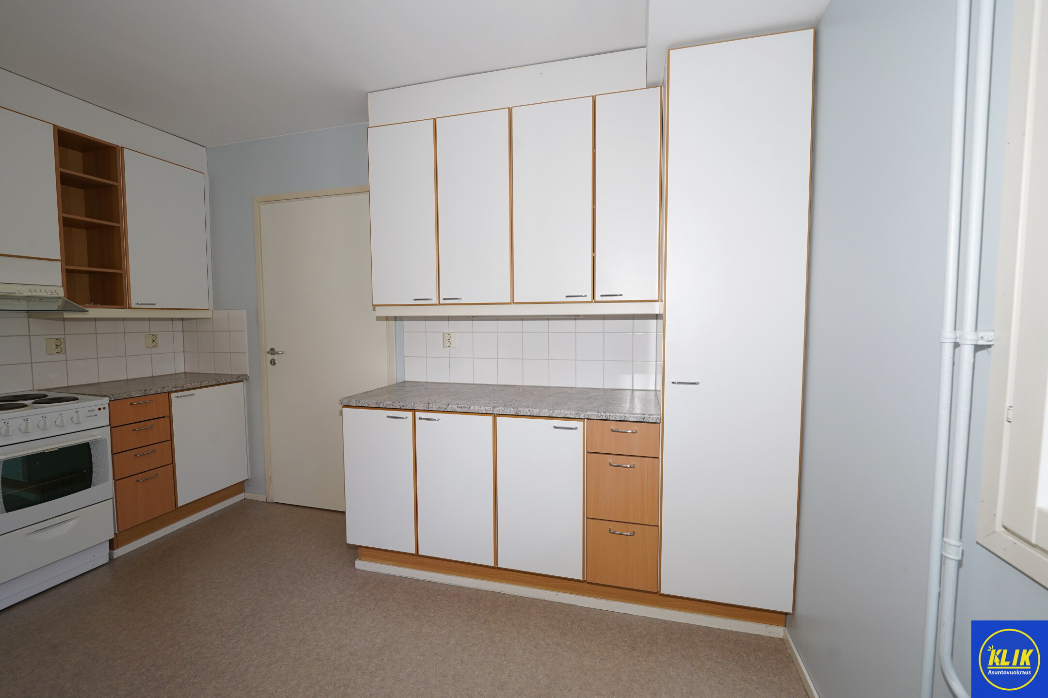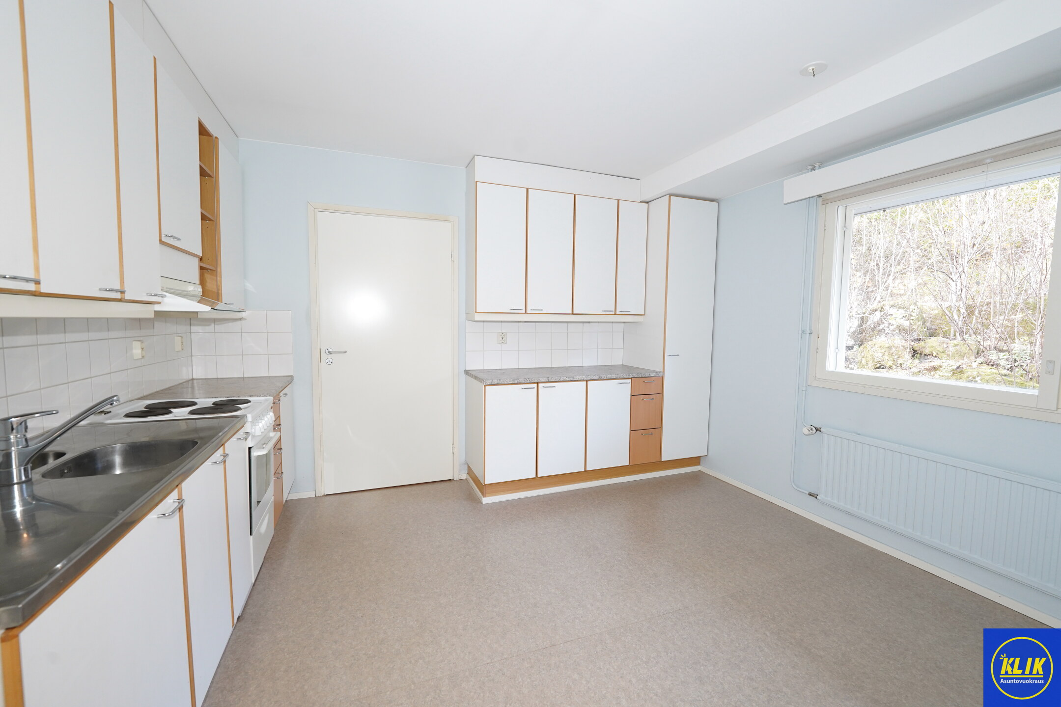erillinen keittiöterästasot keittiössä; laminaattitasot keittiössä, sähköliesi; liesituuletin, pesukoneliitos, astianpesukone on mahdollista asentaa, jenkkikaappi, tilaa isolle ruokapöydälle; paljon kaappitilaa; paljon työskentelytilaa; suuri tiskipöytä