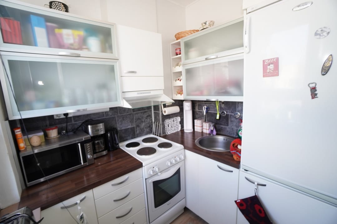 keittokomero, laminaattitasot keittiössä, sähköliesi; liesituuletin, jääkaappi, mikro valmiina keittiössä