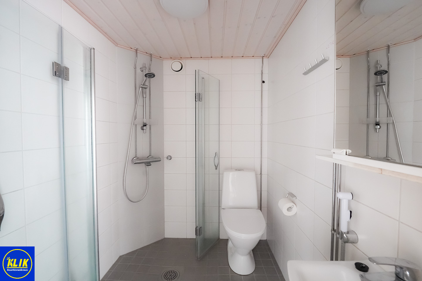 laattalattia; laattaseinä, allaskaappi; peilikaappi, suihku; suihkuseinä, pesukonevalmius, kylpyhuoneessa lattialämmitys