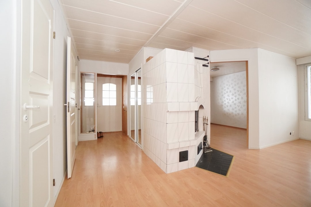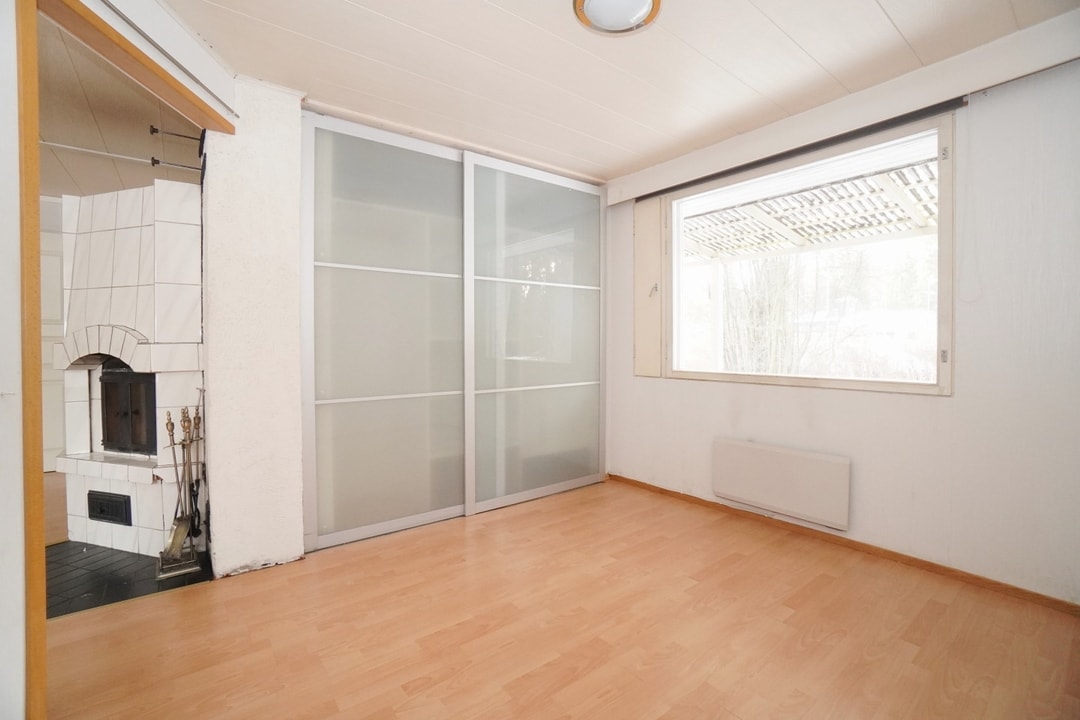 Olohuoneessa on takka ja tilaan on tulossa vielä ilmalämpöpumppu, joka pienentää lämmityskuluja talvikuukausina.