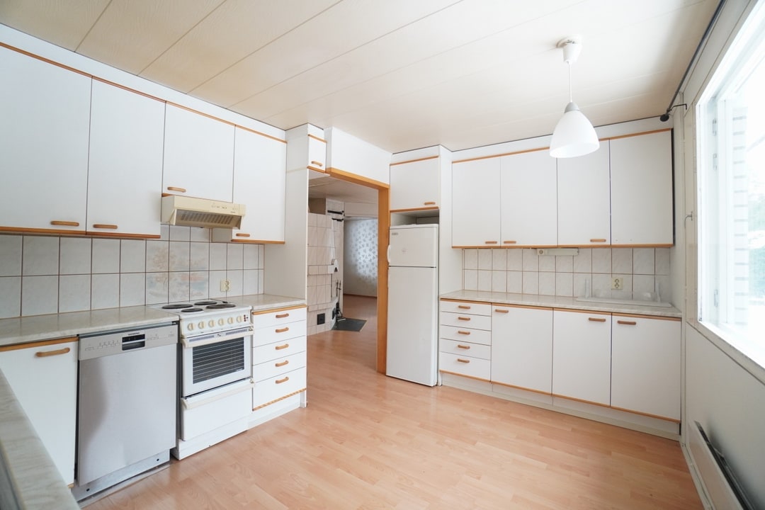 erillinen keittiö, terästasot keittiössä; laminaattitasot keittiössä, sähköliesi; liesituuletin, astianpesukone (45cm), jääkaappipakastin, paljon kaappitilaa; paljon työskentelytilaa