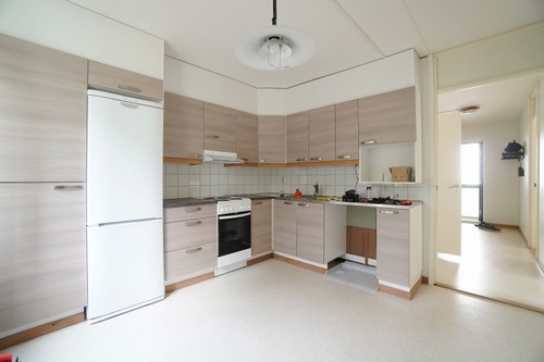 Iso keittiö, johon mahtuu hyvin ruokapöytä. Varustuksena siistikuntoinen liesi, liesituuletin ja jääkaappipakastin. Keittiöön asennetaan vielä astianpesukone.