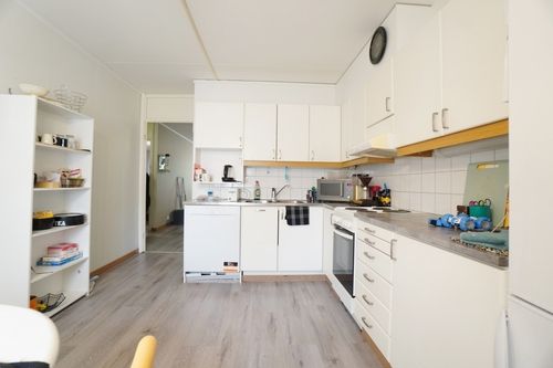 erillinen keittiö, laminaattitasot keittiössä, sähköliesi; liesituuletin, astianpesukone (60cm), jääkaappipakastin, tilaa isolle ruokapöydälle; paljon kaappitilaa; paljon työskentelytilaa