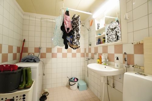 Molemmat makuuhuoneet ovat reilun kokoisia ja sängyille on hyvin tilaa. Kylpyhuoneessa on liitännät pesukoneelle ja hyvin tilaa pyykkien kuivattamiseen.