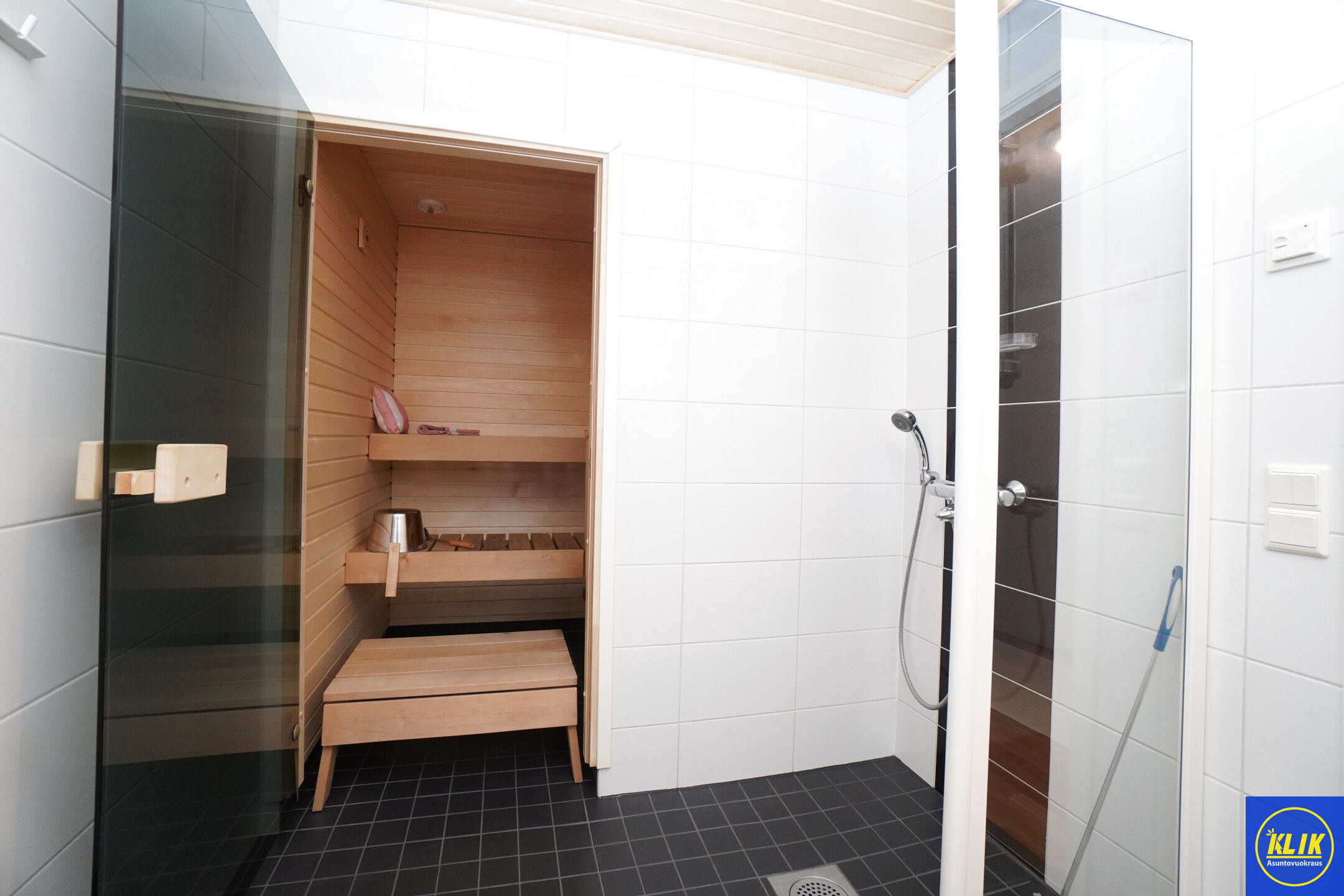laattalattia; laattaseinä, , allaskaappi; peilikaappi; pyykkikaappi; muuta säilytystilaa WC:ssä, suihku; suihkuseinä, , pesukonevalmius, oma sauna