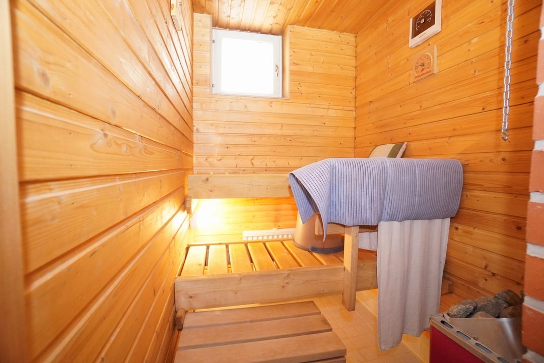 Kylpyhuone on kauttaaltaan siistikuntoinen ja kaakeloitu, pesukoneelle on liitännät. Kylpyhuoneen yhteydessä on oma sauna. Lisäksi asuntoon kuuluu erillinen wc.
