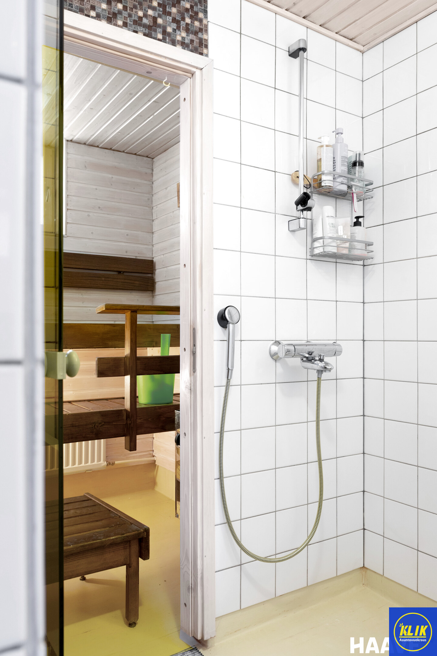 muovimatto; laattaseinä, allaskaappi; muuta säilytystilaa WC:ssä, suihku, pesukonevalmius, oma sauna; kylpyhuoneessa avattava ikkuna
