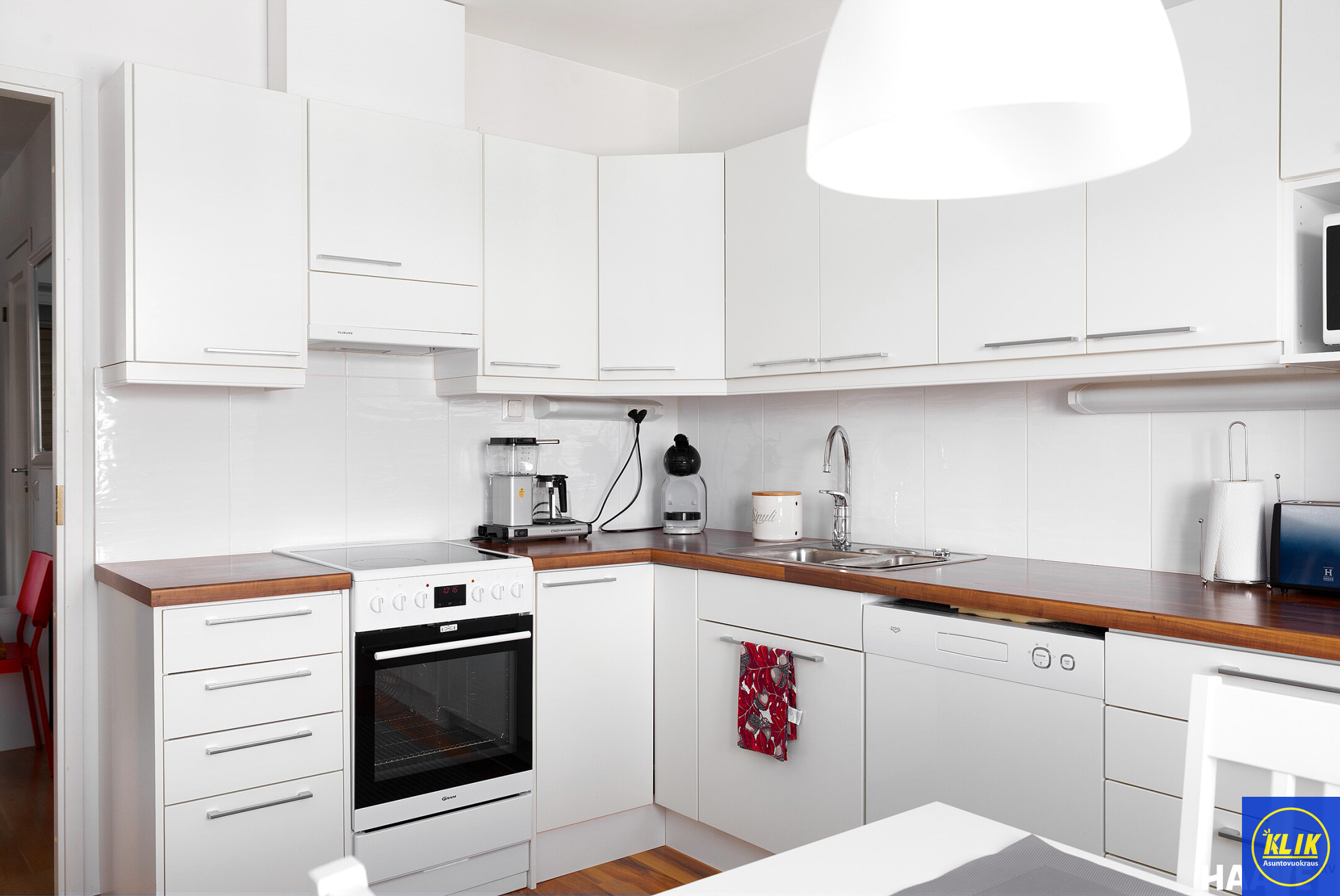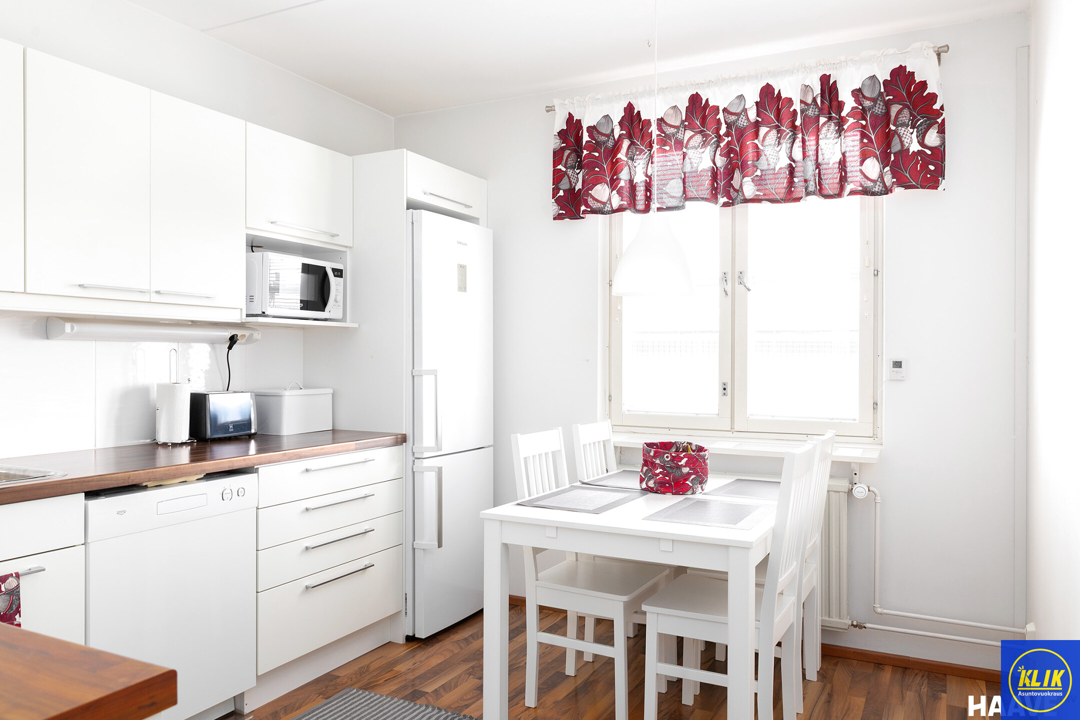 erillinen keittiölaminaattitasot keittiössä, keraaminen- tai induktioliesi; liesituuletin, astianpesukone (60cm), jääkaappipakastin, tilaa isolle ruokapöydälle; paljon kaappitilaa; paljon työskentelytilaa; mikrohylly
