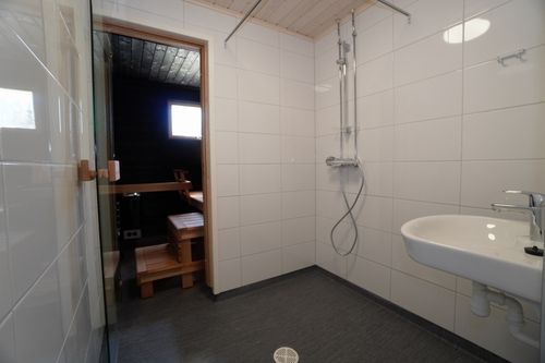 Kylpyhuoneen yhteydessä on oma sauna ja mukavuutta lisäävä lattialämmitys.