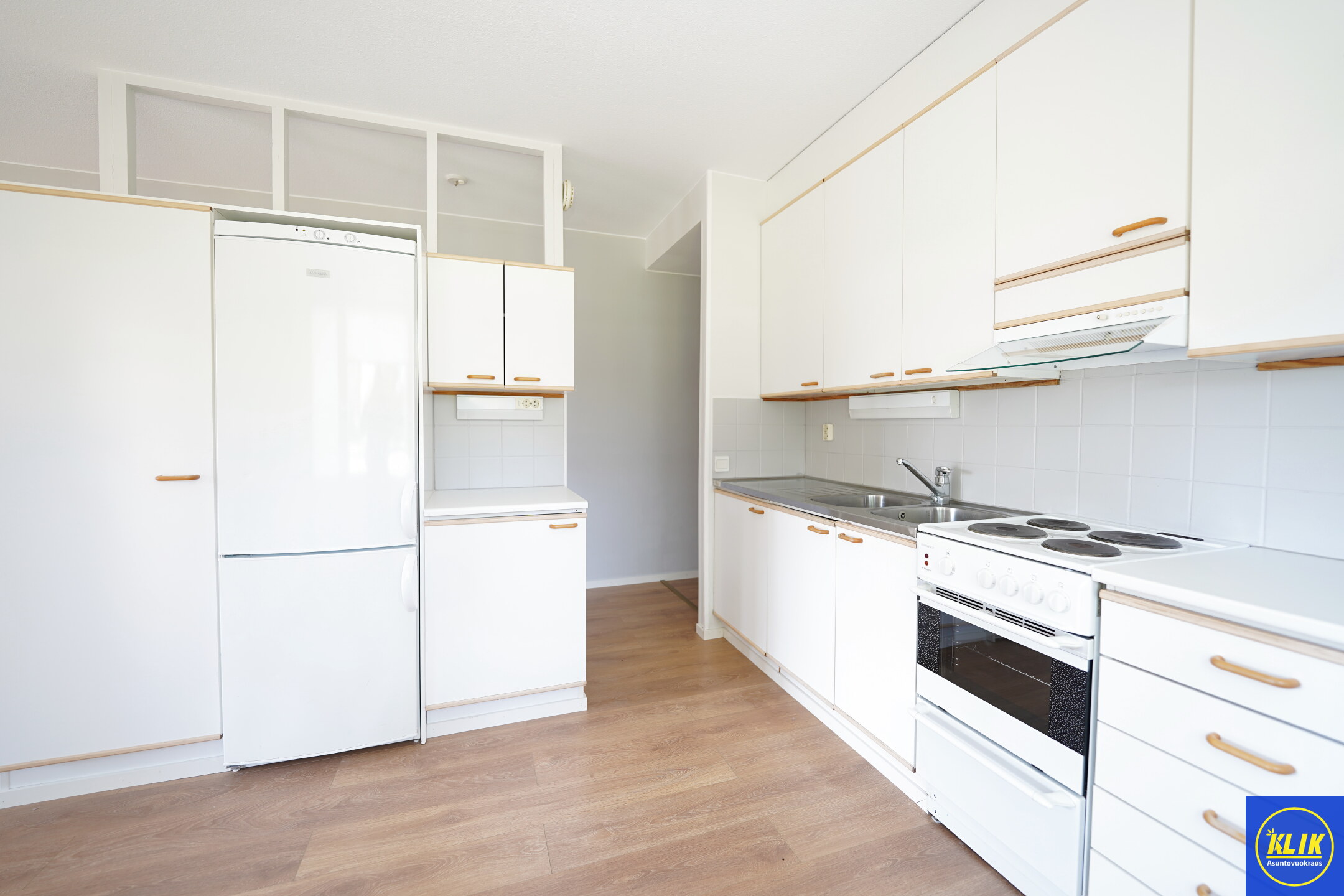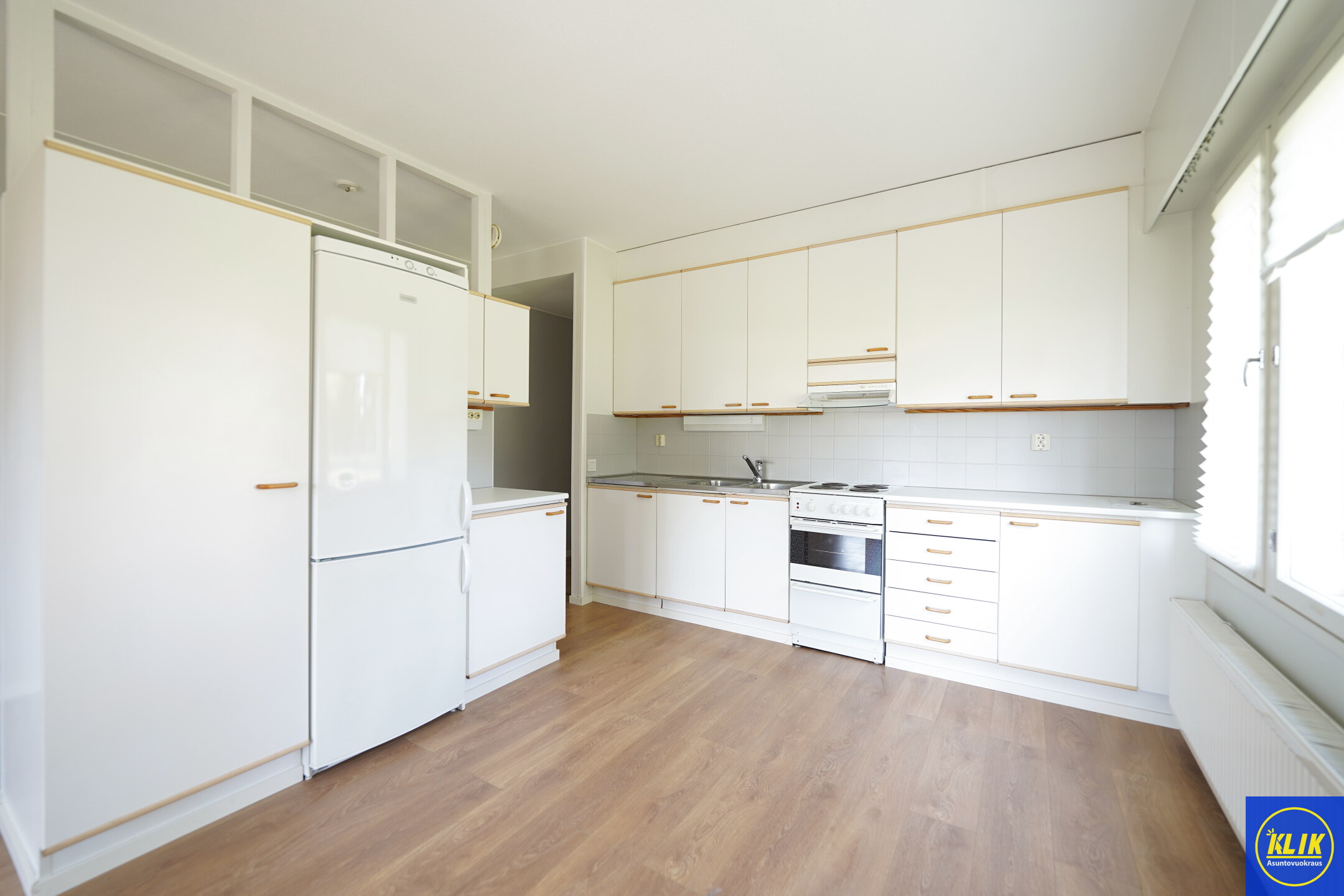 avokeittiöterästasot keittiössä; laminaattitasot keittiössä, sähköliesi; liesituuletin, pesukoneliitos, astianpesukone on mahdollista asentaa, jääkaappipakastin, tilaa isolle ruokapöydälle; paljon kaappitilaa; paljon työskentelytilaa; suuri tiskipöytä