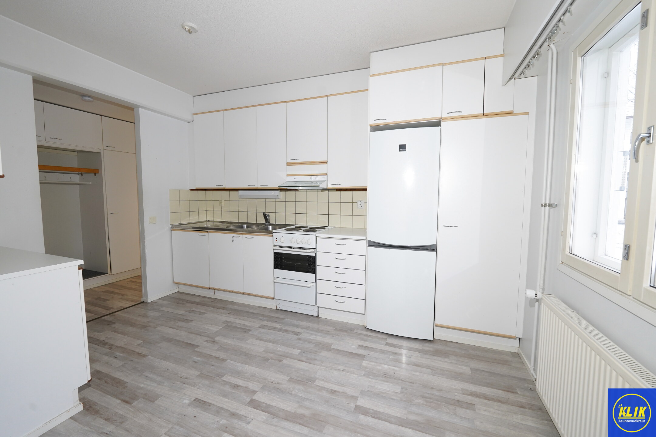 avokeittiöterästasot keittiössä; laminaattitasot keittiössä, sähköliesi; liesituuletin, pesukoneliitos, astianpesukone on mahdollista asentaa, jääkaappipakastin, tilaa isolle ruokapöydälle; paljon kaappitilaa; paljon työskentelytilaa; suuri tiskipöytä