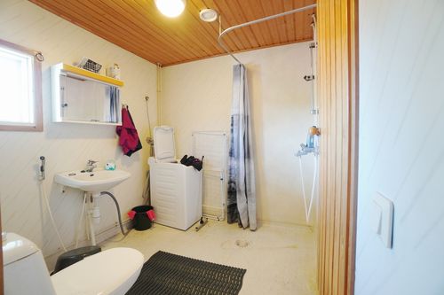Makuuhuoneen yhteydessä on seinän mitalta kaapistoja. Parisänky mahtuu tilaan hyvin. Kylpyhuoneessa on paikka vaikka pesutornille. Kylpyhuonekalusteet ja pinnat ovat siistit ja kylpyhuonekin on kooltaan tilava. Oma sauna toimii kirsikkana kakun päällä. Hieno kokonaisuus luhtitalosta loistavalla sijainnilla!