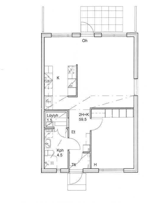 erillinen keittiö, laminaattitasot keittiössä, sähköliesi; liesituuletin, pesukoneliitos, astianpesukone on mahdollista asentaa, jääkaappipakastin, tilaa isolle ruokapöydälle; paljon kaappitilaa; paljon työskentelytilaa; suuri tiskipöytä; mikrohylly