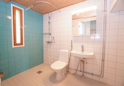 Kylpyhuone on kauttaaltaan laatoitettu ja hyvin siistissä kunnossa. Kylpyhuoneen kruunaa lattialämmitys ja oma sauna. Pesukoneelle on liitännät.