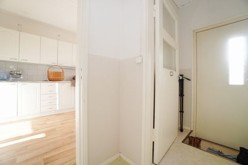 Keittiössä on hyväkuntoiset kodinkoneet ja paljon kaapistoja. Varustukseen kuuluu pyykinpesukone, joka on valmiina uuden asukkaan käyttöön. Keittiöstä on näkymä rauhalliselle sisäpihalle. Tilava huone on valoisa ja näkymä kadulle päin. Huoneen yhteydessä on hyvin säilytystilaa kaappien muodossa. Eteisessä on lisää kaappitilaa. Kylpyhuone on perussiistissä kunnossa.