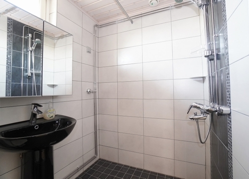 laattalattia; laattaseinä, peilikaappi, suihku, pesukonevalmius, avattava ikkuna