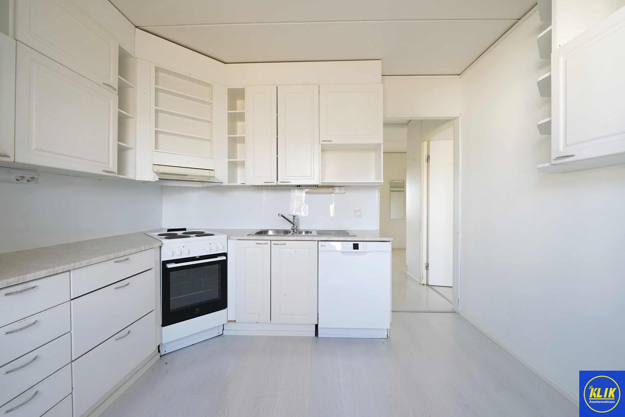 erillinen keittiölaminaattitasot keittiössä, sähköliesi, astianpesukone (60cm), jääkaappipakastin,