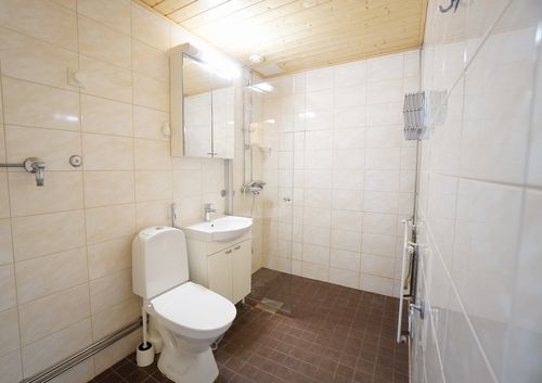 Kauniiksi kunnostettu kylpyhuone, jossa on paikka vaikka pesutornille tarvittaessa. Tilassa on pyyhekuivain ja siistit kalusteet.