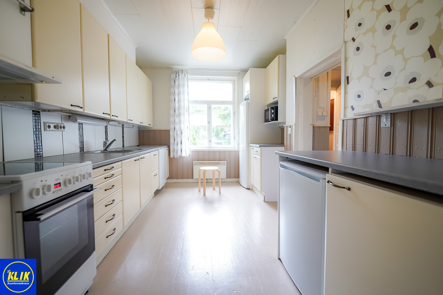 erillinen keittiölaminaattitasot keittiössä, keraaminen- tai induktioliesi; liesituuletin, astianpesukone (60cm), jääkaappi; pakastin, paljon kaappitilaa; paljon työskentelytilaa; mikro valmiina keittiössä; mikrohylly