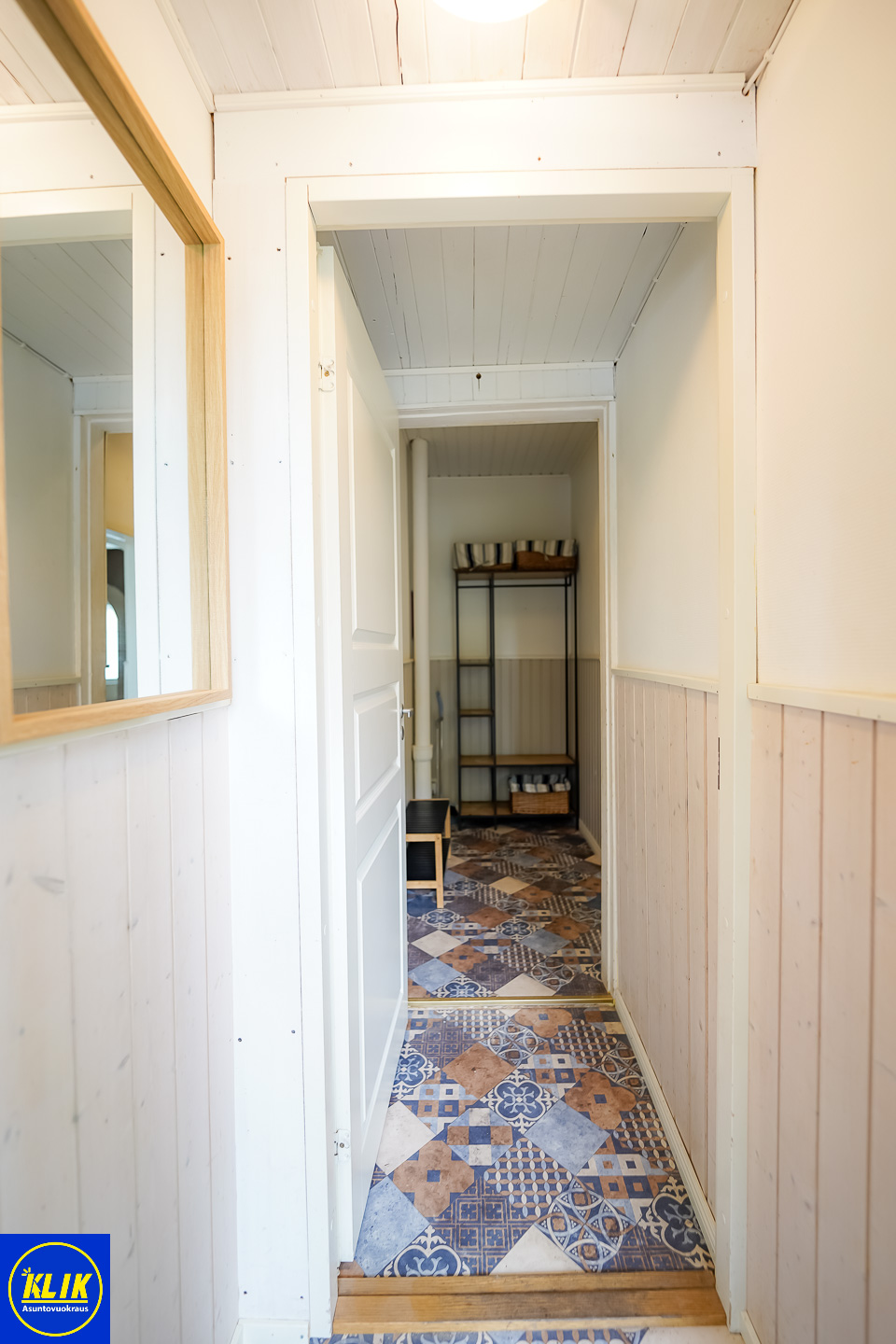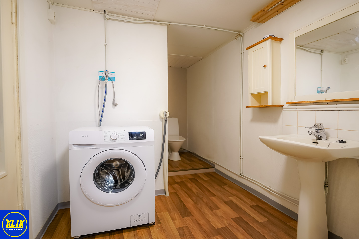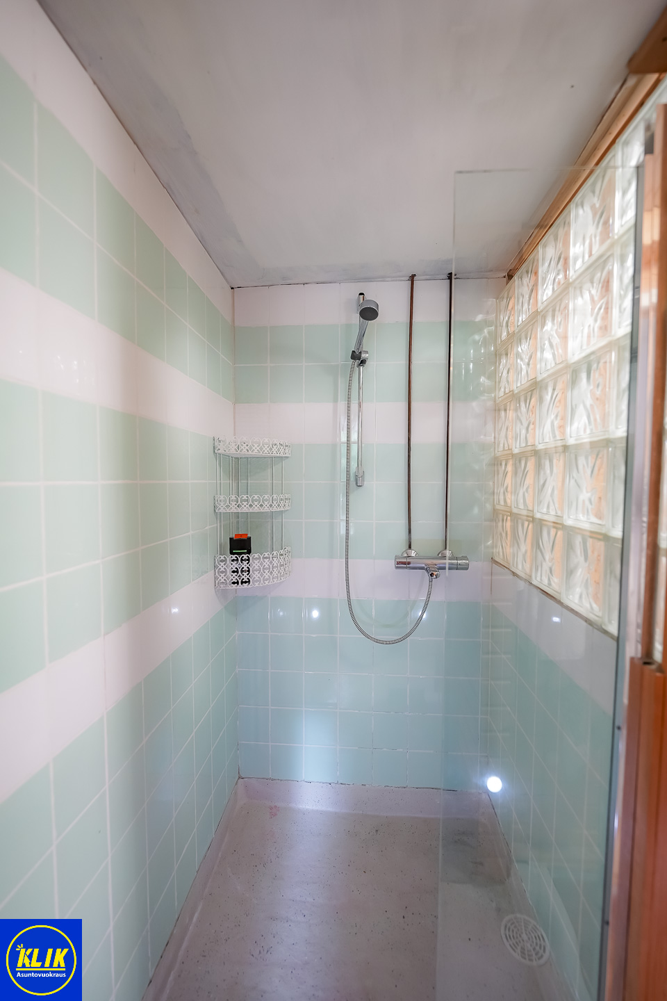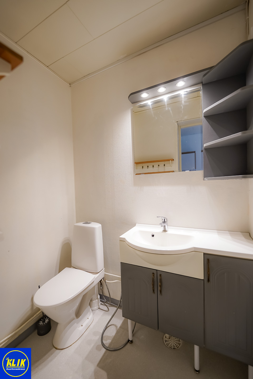 muovimatto; laattaseinä, asunnossa kaksi WC:tä, allaskaappi; peilikaappi; korkea kaappi; pyykkikaappi; muuta säilytystilaa WC:ssä, suihku; suihkuseinä, , pesukonevalmius; pyykinpesukone valmiina asunnossa, oma sauna