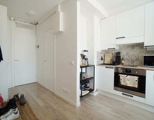 avokeittiö, laminaattitasot keittiössä, keraaminen- tai induktioliesi; liesi ja uuni erikseen; liesituuletin, astianpesukone (45cm); Integroitu, jääkaappipakastin,