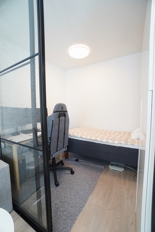 Alkovi on saatu omaksi tilakseen lasisten tilanjakajien avulla, joista toinen toimii liukukiskolla.