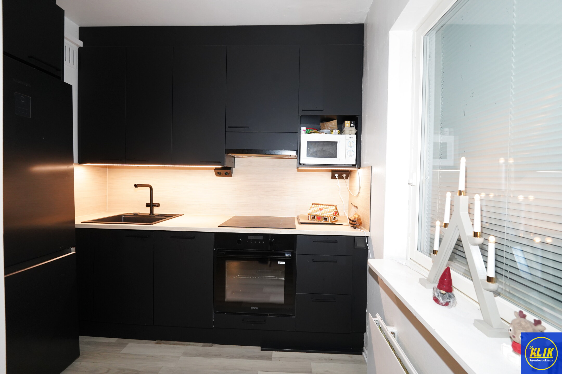avokeittiölaminaattitasot keittiössä, keraaminen- tai induktioliesi; liesituuletin, astianpesukone (45cm), jääkaappipakastin, mikrohylly