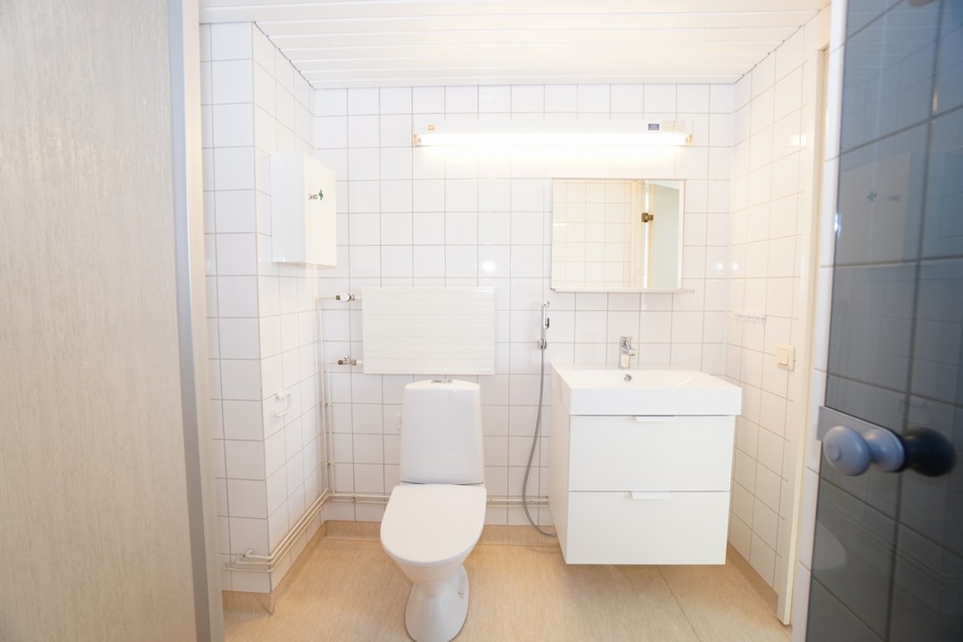Kylpyhuone on tilava ja sen yhteydessä on oma sauna. Pesukoneelle on liitännät valmiina.