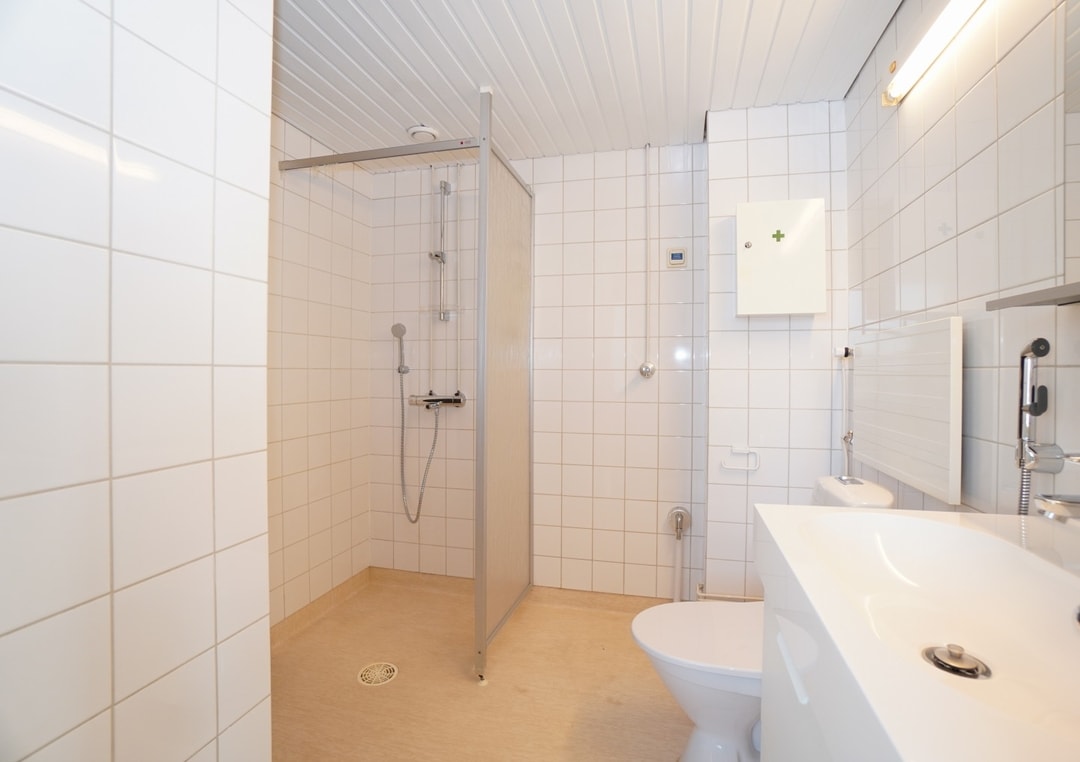 muovimatto; laattaseinä, allaskaappi, suihku; suihkuseinä, pesukonevalmius, sauna