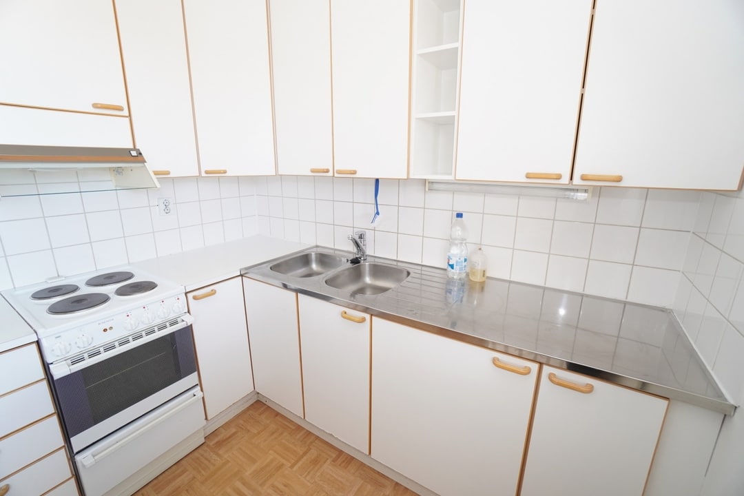 Asunnon pinnat ovat siistit ja lattiassa on parketti, keittiössä muovimatto. Asuntoon kuuluu ranskalainen parveke kadulle päin.
