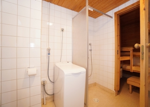 Kylpyhuoneessa on pyykinpesukone valmiina asukkaan käyttöön ja oma sauna on arjen luksusta.
