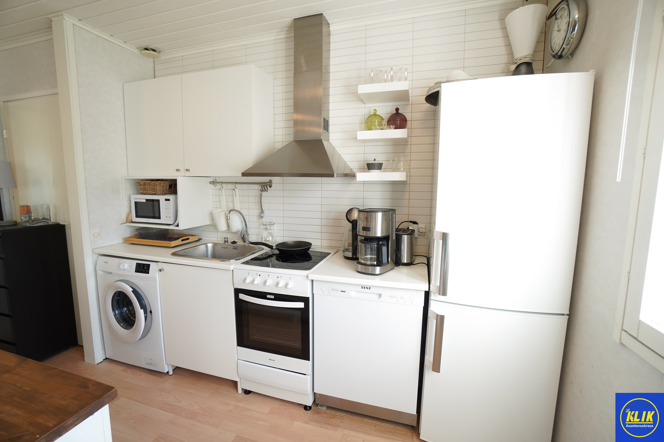 avokeittiölaminaattitasot keittiössä, keraaminen- tai induktioliesi; liesituuletin, astianpesukone (60cm), jääkaappipakastin, tilaa isolle ruokapöydälle; paljon kaappitilaa; paljon työskentelytilaa; mikro valmiina keittiössä; mikrohylly