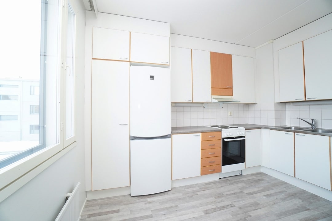 Keittiössä on paljon kaappitilaa ja vaaleat pinnat. Astianpesukoneelle on liitännät ja valmis paikka, joten sellaisen saa asennettua helposti.