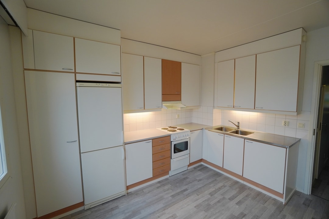 Keittiössä on paljon kaappitilaa ja vaaleat pinnat. Astianpesukoneelle on liitännät ja valmis paikka, joten sellaisen saa asennettua helposti.