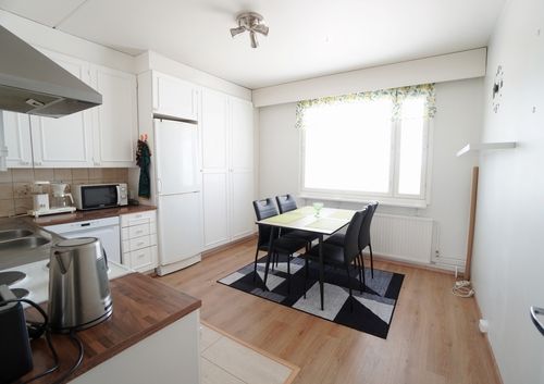 erillinen keittiö, terästasot keittiössä; laminaattitasot keittiössä, sähköliesi; liesituuletin, astianpesukone (60cm), jääkaappipakastin, tilaa isolle ruokapöydälle; paljon kaappitilaa; paljon työskentelytilaa; suuri tiskipöytä