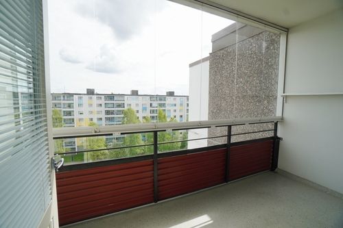 Olohuoneen kautta on kulku lasitetulle parvekkeelle sisäpihan suuntaan.