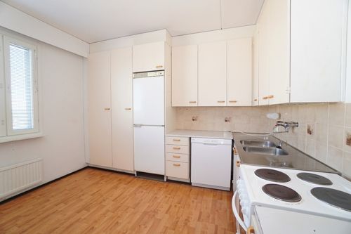 erillinen keittiö, laminaattitasot keittiössä, sähköliesi, astianpesukone (60cm), jääkaappi, tilaa isolle ruokapöydälle; paljon kaappitilaa; paljon työskentelytilaa; suuri tiskipöytä