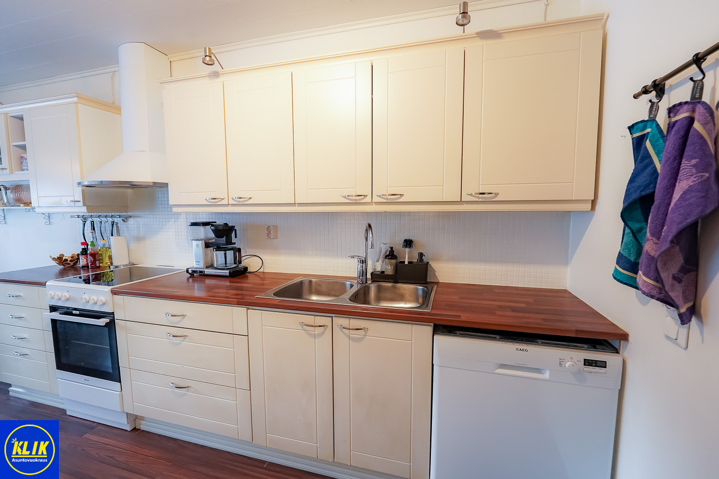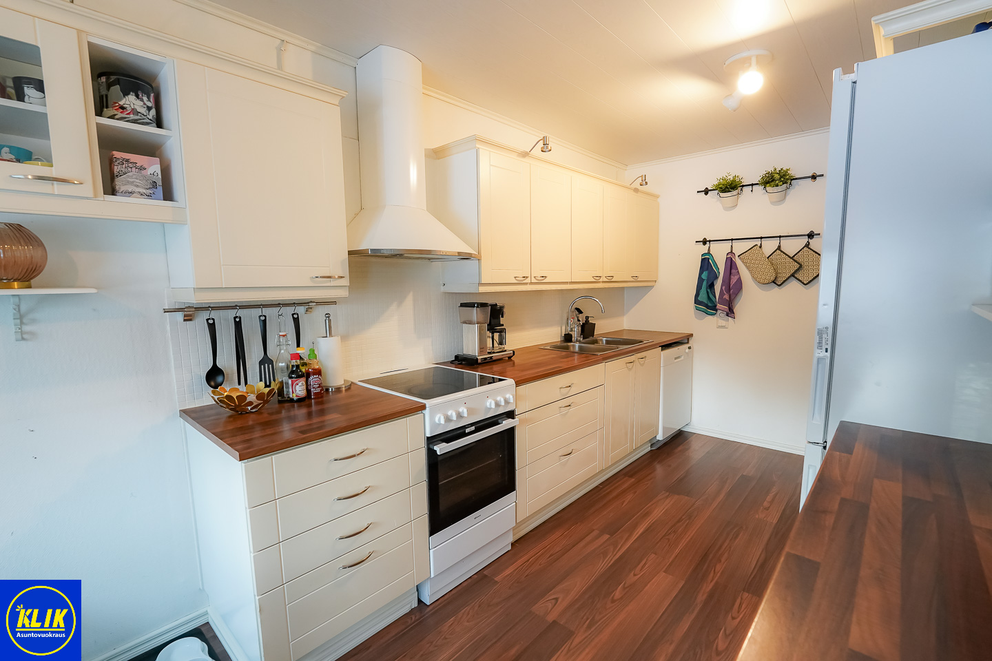 erillinen keittiölaminaattitasot keittiössä, keraaminen- tai induktioliesi; liesituuletin, astianpesukone (60cm), jääkaappipakastin, tilaa isolle ruokapöydälle; paljon kaappitilaa; paljon työskentelytilaa; mikrohylly