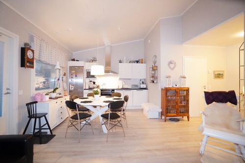 Keittiössä on kykyaikaiset rosteriset kodinkoneet ja runsaasti kaappitilaa. Keittiö ja olohuone ovat yhtä avaraa tilaa. Tilan tuntua ja avaruutta asunnossa tuo normaalia korkeampi huonekorkeus. Olohuoneesta on käynti tilavalle terassille.