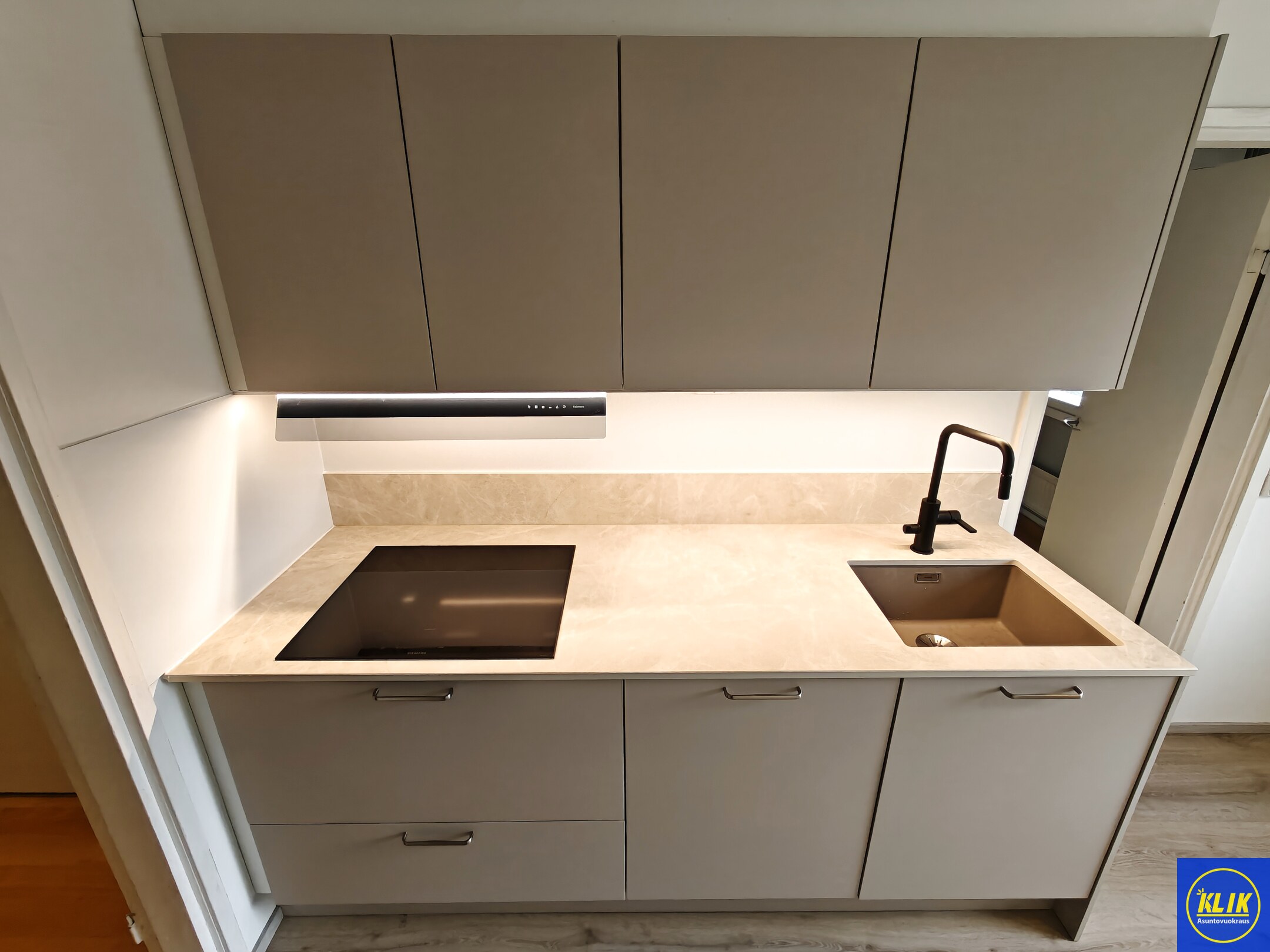 erillinen keittiökomposiittitasot keittiössä, keraaminen- tai induktioliesi; keittotaso ja kalusteuuni; liesituuletin, astianpesukone (60cm), jääkaappipakastin, tilaa isolle ruokapöydälle; paljon kaappitilaa; mikro valmiina keittiössä