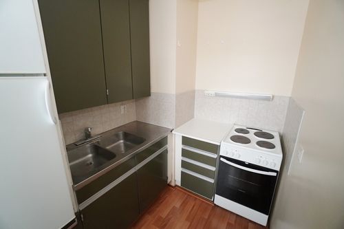 Huone on tilava, jonka yhteyteen mahtuu sänky. Säilytystilana toimivat eteisen kaapistot. Keittiössä yleisilmeeltään siisti kaapistot, liesi ja jääkaappi. Kylpyhuone on kauttaaltaan laatoitettu vaalein ja harmain sävyin ja vuokralaiselle on pesukone valmiina käytettäväksi.