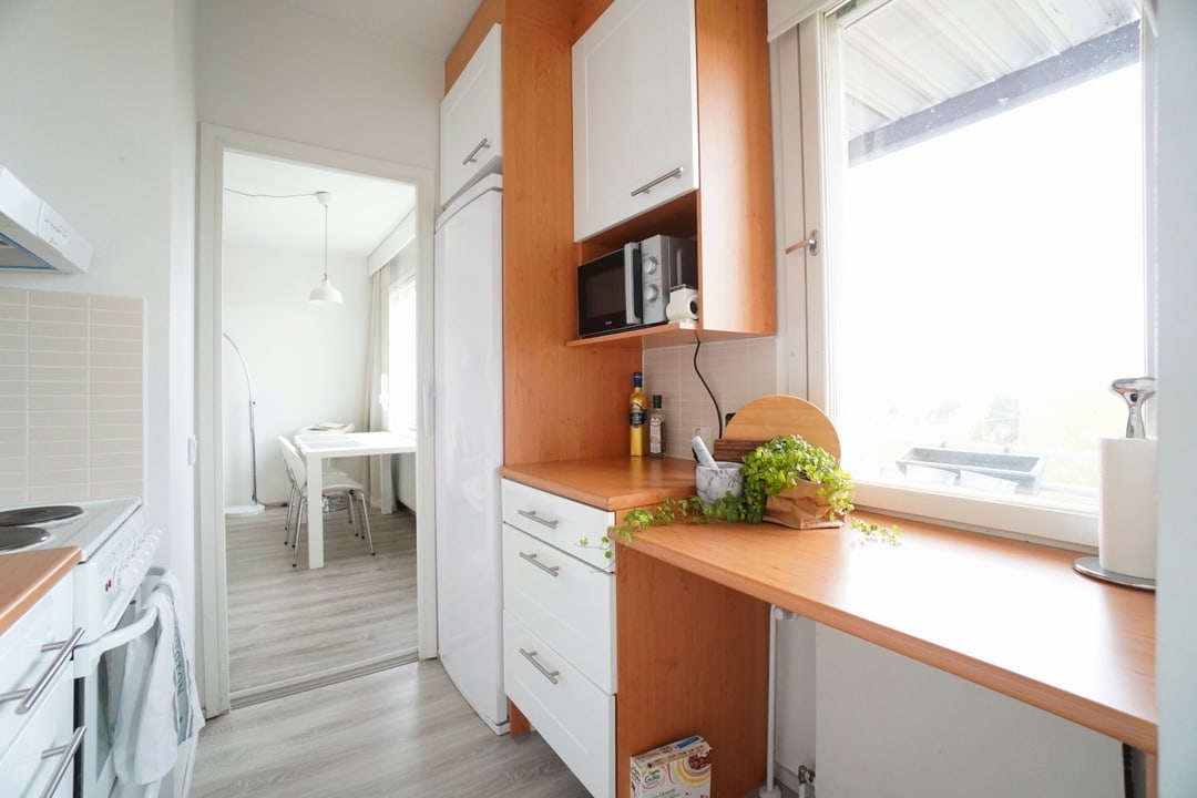Keittiö on kauttaaltaan siistissä kunnossa. Keittiössä on erinomaisesti säilytystilaa ja hyväkuntoiset kodinkoneet.