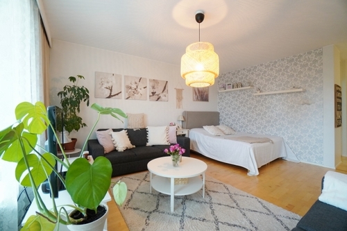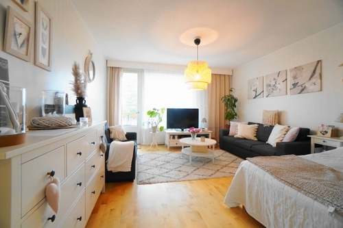 Asunnossa on erillinen makuuhuone ja tilava olohuone. Olohuoneen yhteydessä on parveke.